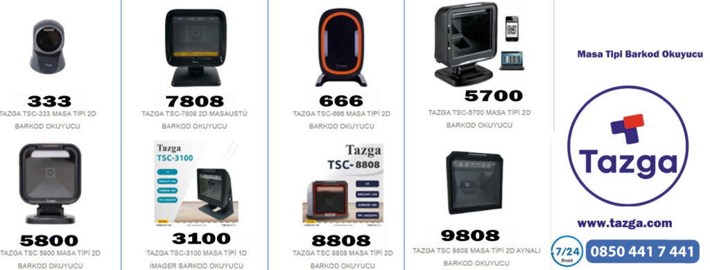 Masa tipi barkod okuyucu çözümleri, perakende ve endüstriyel operasyonlarda hız, doğruluk ve ergonomiyi aynı anda sunar. Görselde yer alan Tazga masa tipi barkod okuyucu serisi, farklı kullanım senaryolarına uygun model çeşitliliği ve güçlü okuma teknolojileriyle işletmelerin dijital dönüşümüne katkı sağlar.